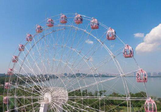 據(jù)介紹,摩天輪 28 個(gè)座艙采用「櫻花粉」色系,可同時(shí)容納 112 人乘坐,內(nèi)設(shè)空調(diào)和自定義藍(lán)牙音箱,運(yùn)轉(zhuǎn)一圈的時(shí)間是 13 分 14 秒。當(dāng)摩天輪轉(zhuǎn)到最高點(diǎn)時(shí),方圓 20 公里的東湖美景便能盡收眼底。