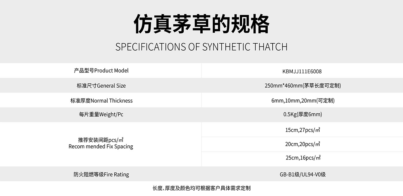 ? ? ? ? 仿真茅草是深圳市科佰工貿(mào)有限公司采用目前國際上先進的納米合成高分子材料技術(shù)和工藝生產(chǎn)。利用納米粒子的特有的物理化學(xué)性質(zhì),使得其具有更加優(yōu)異的耐候性及阻燃性,能滿足美國ASTM-G154-06 抗UV老化測試標(biāo)準(zhǔn),并能通過美標(biāo)UL94-V0級阻燃,在國內(nèi)仿真茅草也通過了國家防火建材阻燃測試B1級。?